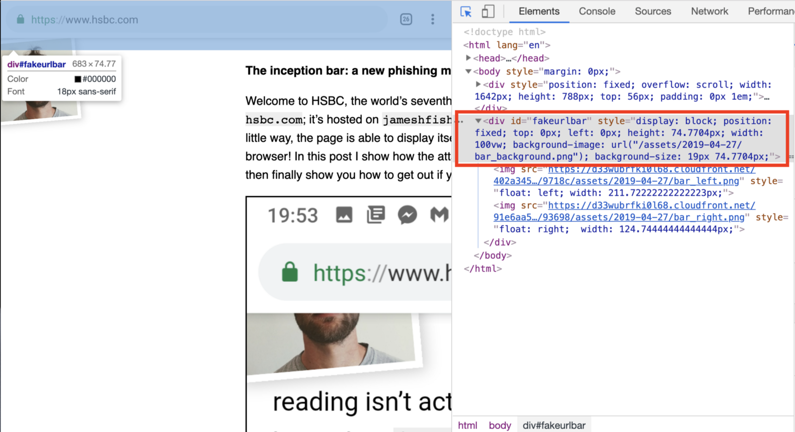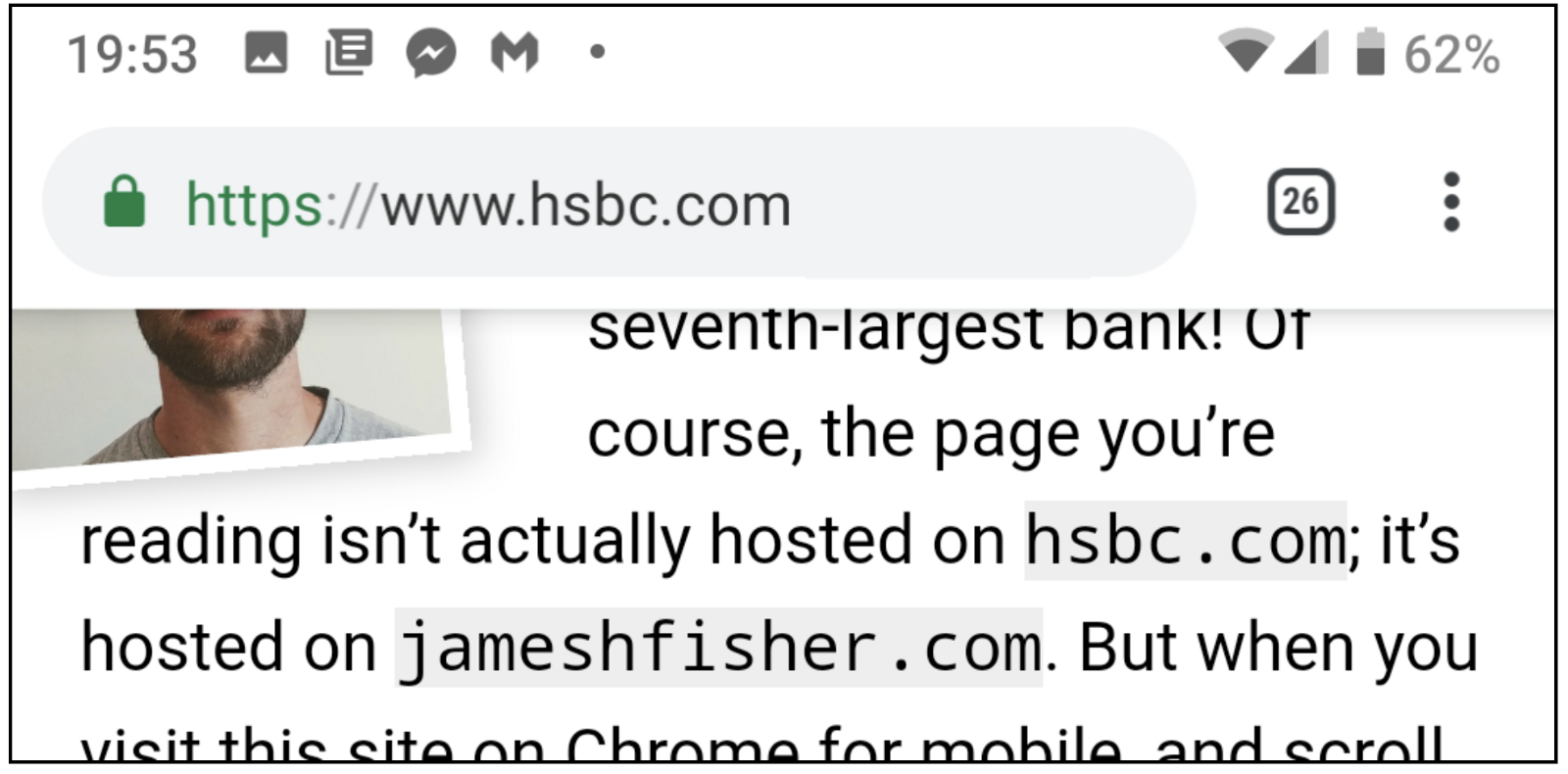 簡單來說,原文作者利用 Chrome 瀏覽器在手機顯示網頁時,利用自動隱藏網址列的特性做了一個假的網址列來欺騙網站使用者,讓使用者以為自己正在瀏覽 hsbc.com底下的網頁 ,但其實使用者是在一個釣魚網站jameshfiser.com裡面,效果如下圖所示。