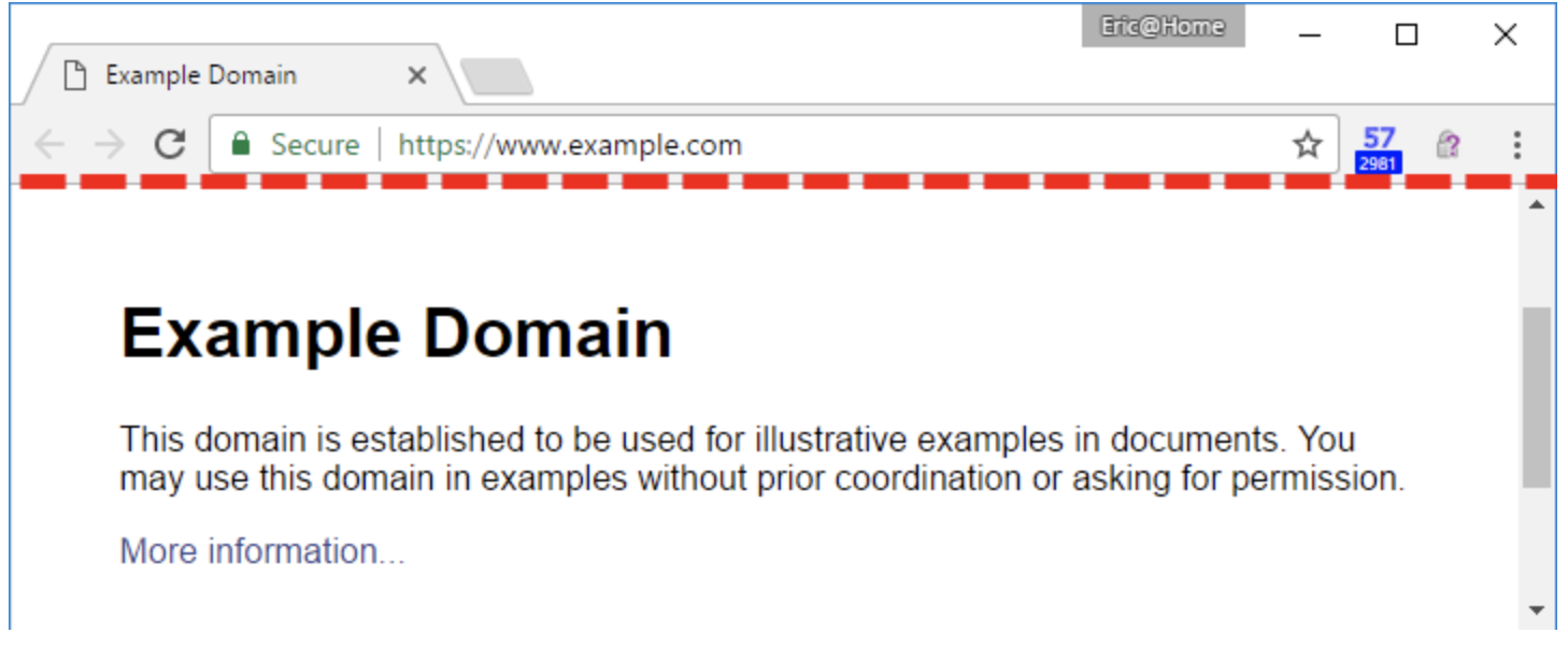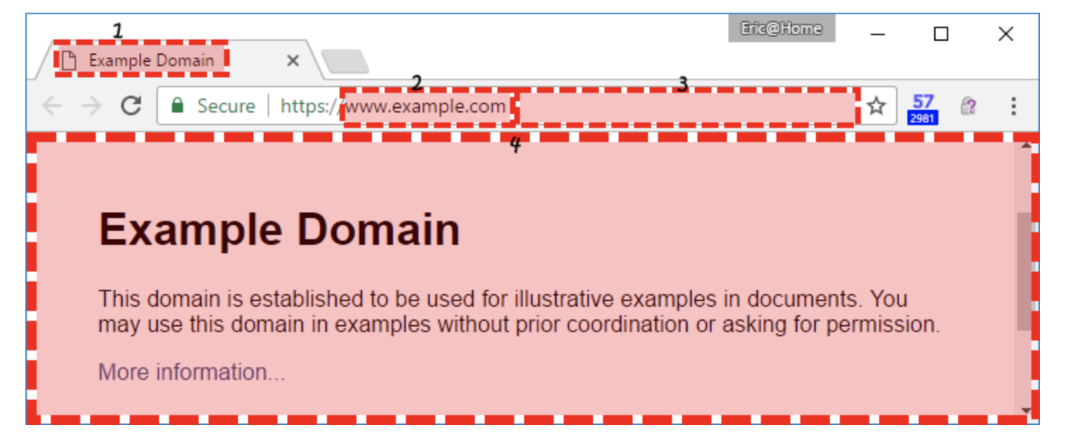 然而,真正的情況是,下圖標示紅色的部分都有可能是「不可相信」的,舉下圖的例子來說,在瀏覽器頁籤上的資訊Example Domain字樣是網站可以自訂的,而在網址列上的網址,駭客可以取一個「很像真的」的網域名,例如:yahoo-accounts.com來欺騙你。