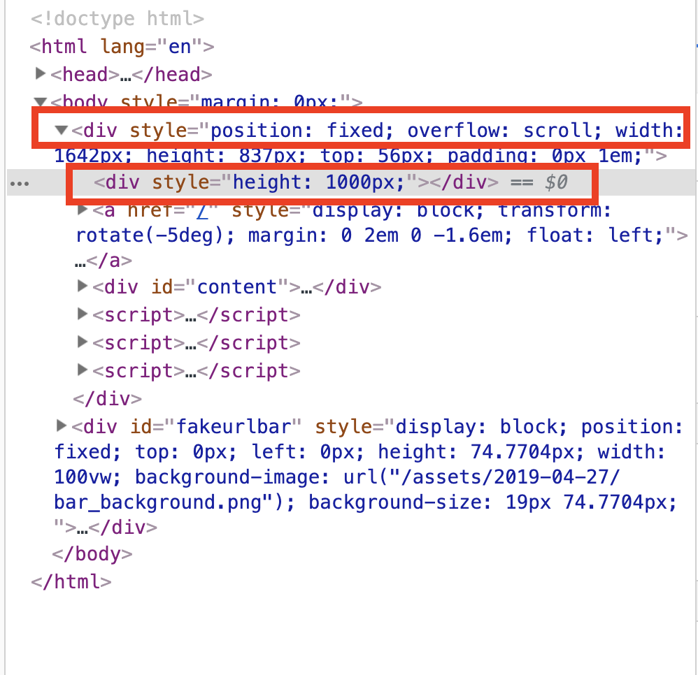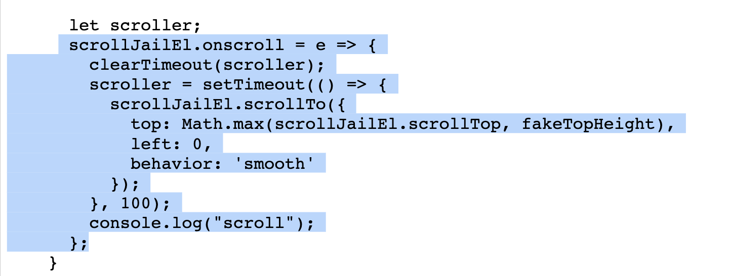 此外,再透過在 body 底下自己新做一個 div ,設定為 overflow: scroll,並在這個 div 裡面放一個 1000 px 高度的元素,當使用者 scroll 的時候,其實只是在這個這個 div 裡面做 scroll ,並不是在 body 裡面做 scroll,作者將這個做法稱為 scroll jail。