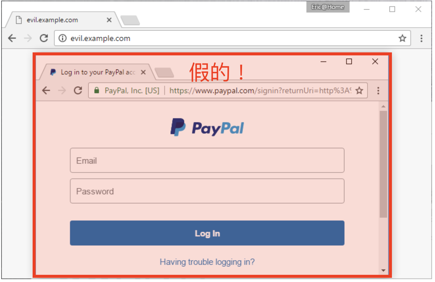 乍看之下,這是一個瀏覽器裡面,有另一個視窗,裡面是 Paypal 網站的登入畫面,網址是www.paypal.com,但實際上,這是一個釣魚網站!evil.example.com這個網站「內容」做得跟新視窗網頁「長得很像」,下圖紅色標示的部分,即是駭客製作的假內容,網址列其實是「一張圖」假冒的,是假的網址列!因此這類攻擊被稱為 Picture-in-picture attacks: