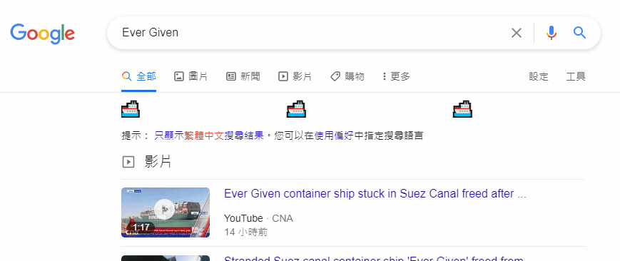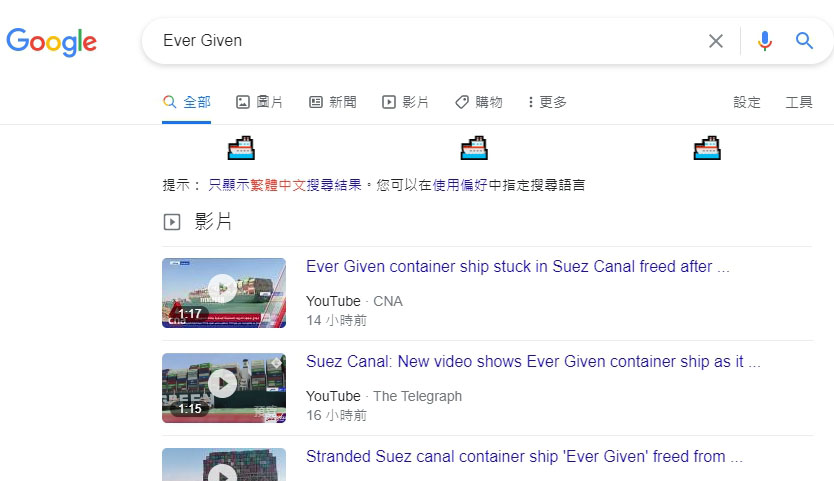 Google 為了慶祝蘇伊士恢復通行,在Google搜尋引擎中加了小彩蛋,只要搜尋時輸入「suez canal」(蘇伊士運河)或「ever given」(長賜號)兩組關鍵字後按下搜尋,搜尋結果下方就會出現由右往左一台接著一台的小貨船航行,與全球一同慶祝蘇伊士運河重新恢復運輸。