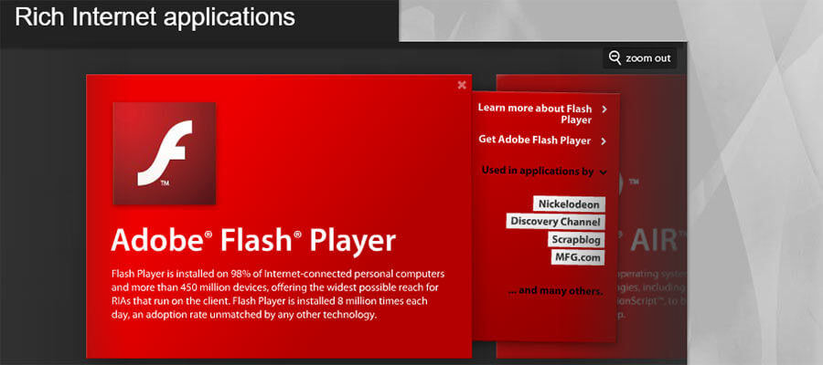 幾乎沒有一項技術能夠像Flash一樣持久,當人們想到Rich Media(豐富多媒體)在線體驗時,Flash進入了網路的世界,這簡直是個白日夢!使用者的硬體設備和帶寬基礎架構都還不夠強大時,它仍然設法提供了基於軟件的解決方案。