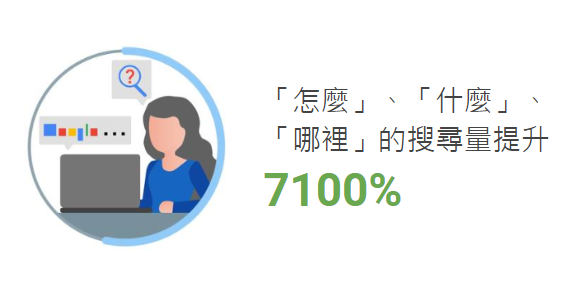 Google搜尋發展至今已有20年,早期的搜尋模式是使用特定關鍵字去找答案,但隨著搜尋能力持續躍進、人工智慧與機器學習也紛紛內建其中,現在使用者可以很直覺地使用自然對話去搜尋,大家也愈來愈常使用「怎麼」、「什麼」、「哪裡」這類字眼去搜尋。舉例來說,過去可能是搜尋「蜂蜜檸檬 作法」,現在則是直接搜尋「怎麼做蜂蜜檸檬」,這類的搜尋量一口氣提升了7100%。