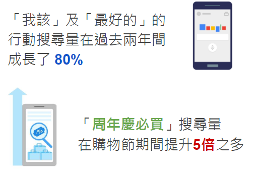 另一方面,使用者也傾向於搜尋所謂的「最佳答案」,過去兩年來使用「我該......」及「最好的」的行動搜尋量成長了80%,像是「最好的旅行枕頭」、「最好的牙刷」這類搜尋量都有倍數成長,「周年慶必買」搜尋量在購物節期間更是提升5倍之多。