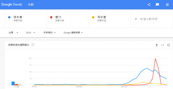在消費型態方面,搜尋特定實體賣場線上購物的搜尋量年度成長78%,顯見網路購物的需求持續提升;值得注意的是,針對年底購物旺季,消費者似乎有提前規劃的趨勢,早在9月起就會開始預先搜尋年底要入手的商品,其中「雙十一」的熱度再攀高峰,搜尋量比同期成長132%,更甚「周年慶」的54%,「雙十一」的搜尋量高峰也明顯超越「周年慶」,但「周年慶」的整體搜尋量仍勝一籌,是「雙十一」的4.5倍。